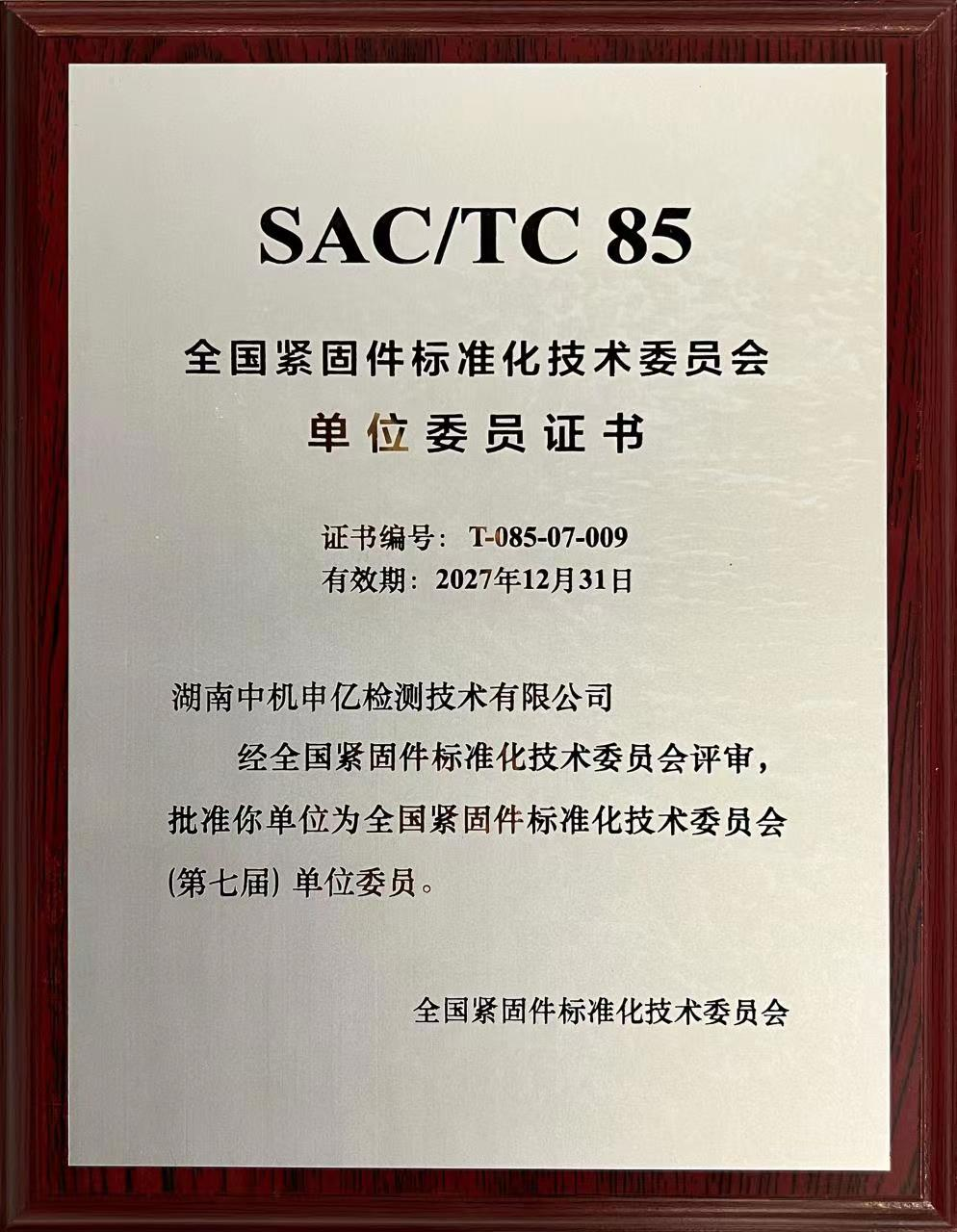日前,全國(guó)緊固件標(biāo)準(zhǔn)化技術(shù)委員會(huì)頒發(fā)(第七屆)單位委員證書,湖南中機(jī)申億檢測(cè)技術(shù)有限公司榮獲該證書。